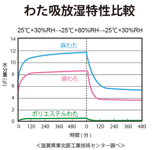 さらに繊維の中に熱を溜めることで一定の温度を保つことができ、麻(ラミー)でありながら綿わた、ウールわた、ポリエステルわたと同等の保温性があります。